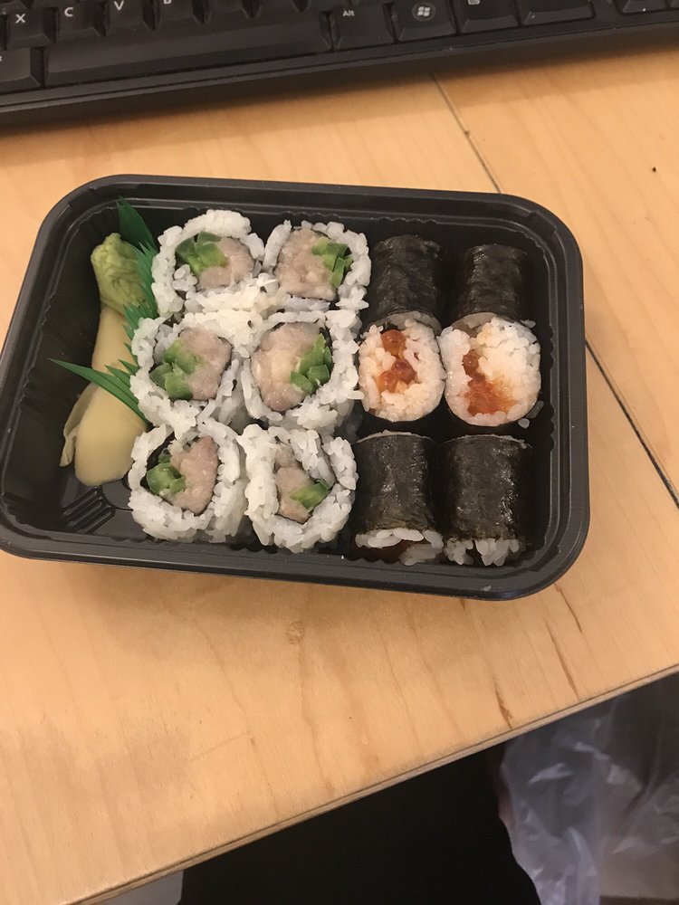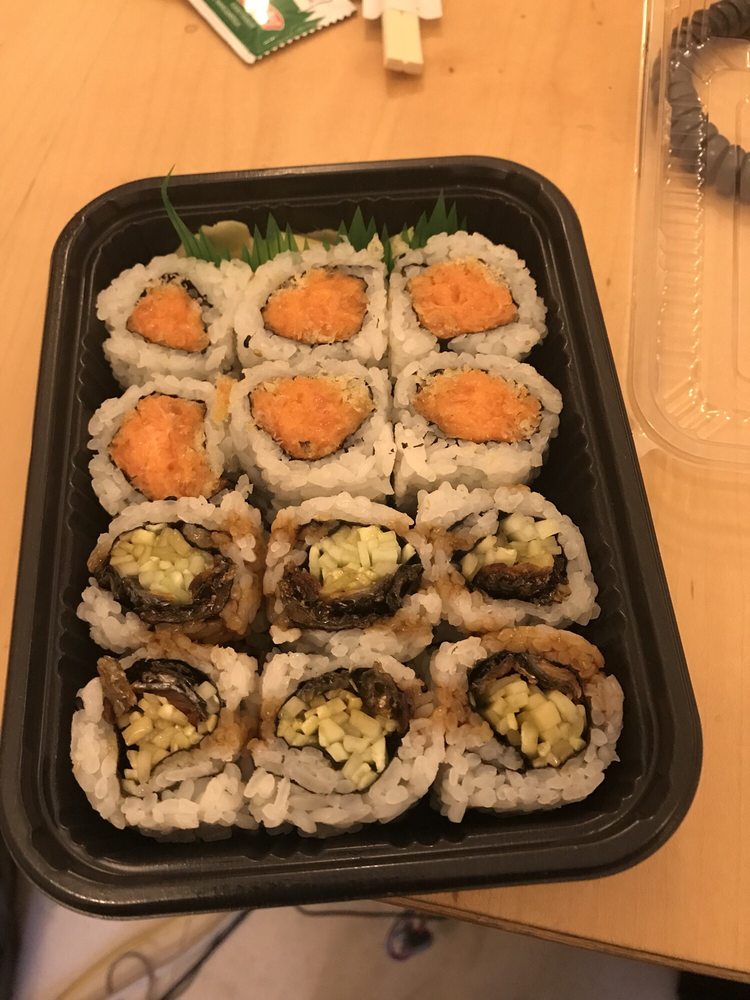 Includes 18 rolls: 3 shrimp avocado, 3 tuna avocado, 3 eel cucumber, 3 salmon, 3 tuna, 2 kamikaze and 1 dinosaur.
