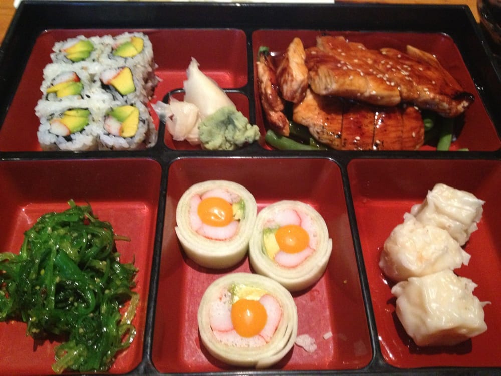 Sushi entree served with miso soup, shumai, rice and a California roll.